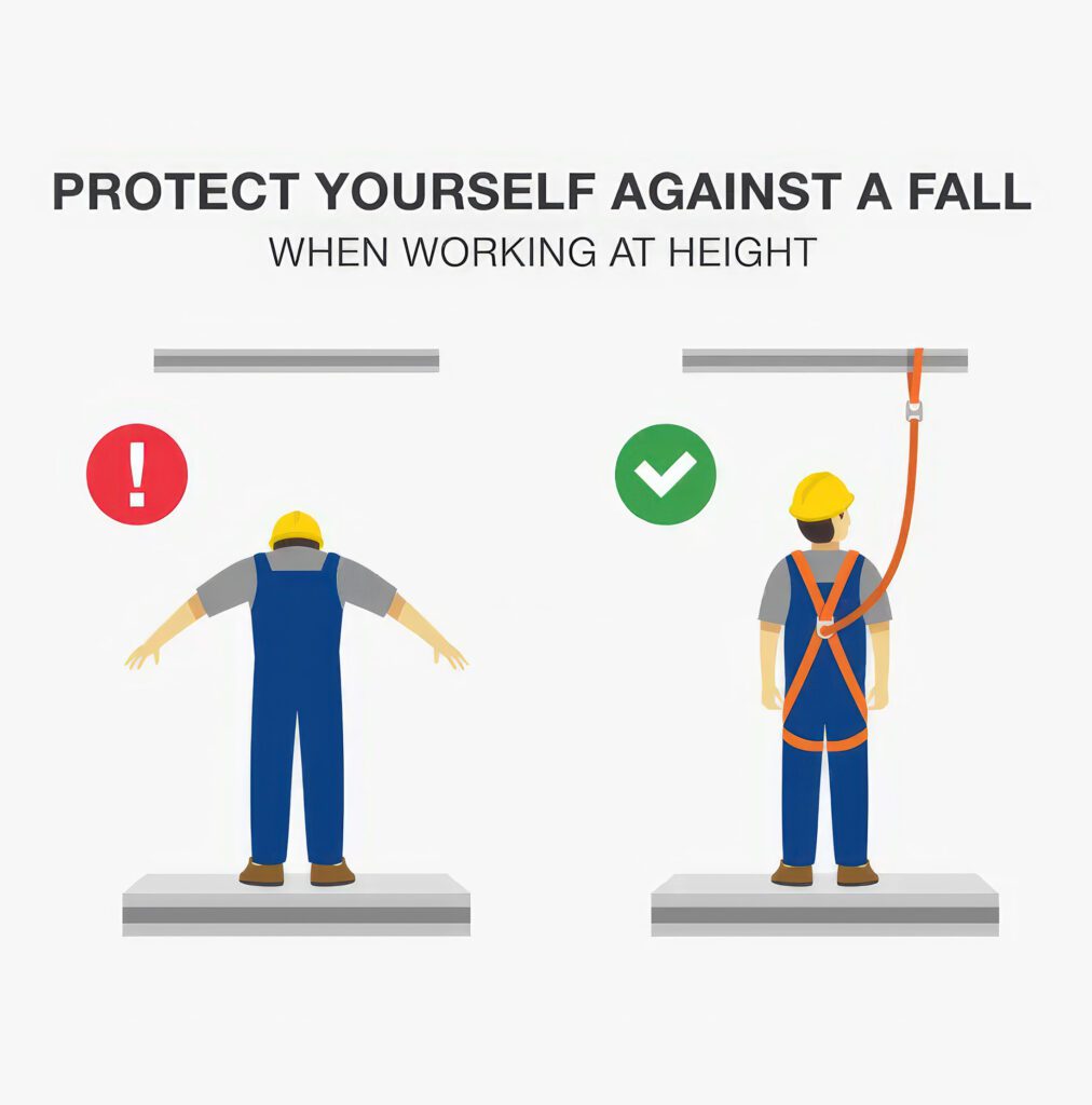 Use the right equipment – harnesses, guardrails, scaffolds, and ladders must be fit for purpose and inspected.